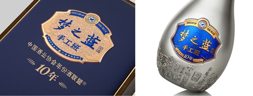 梦之蓝手工班是首家获得“中国酒业协会”授权、由第三方认证机构“方圆标志认证集团有限公司”权威认证的中国高端年份白酒。其中,梦之蓝手工班(10年)延续了手工班系列的经典风格,瓶身选用青枪色为主体色调,展现产品浑厚内敛的品质内涵,寓意手工酿造的时间积淀与工艺传承。外盒正面延续经典活字印刷元素,展现手工之美;局部细节精致打造邮票造型,体现产品珍贵纪念感;侧面用木纹材质年轮交叠中时光流转,呼应老酒老窖的年份卖点。